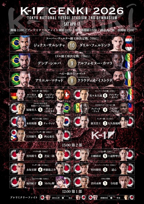 2026年4月11日(土)東京・国立代々木競技場第二体育館『K-1 GENKI 2026』の全対戦カード&試合順が発表された。
