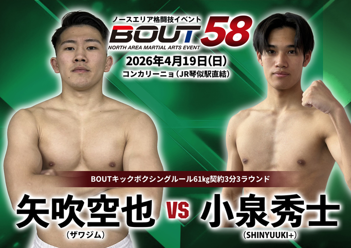 小泉は1月25日開催の『BOUT 57』にて念願のプロファイターとしてのBOUT初参戦を果たし、北濱精悦(Kickboxing Academy Sapporo)に勝利し勢いに乗っての連続出場となる。激しい打ち合いが予想される道内ファイター同士の戦いとなった。