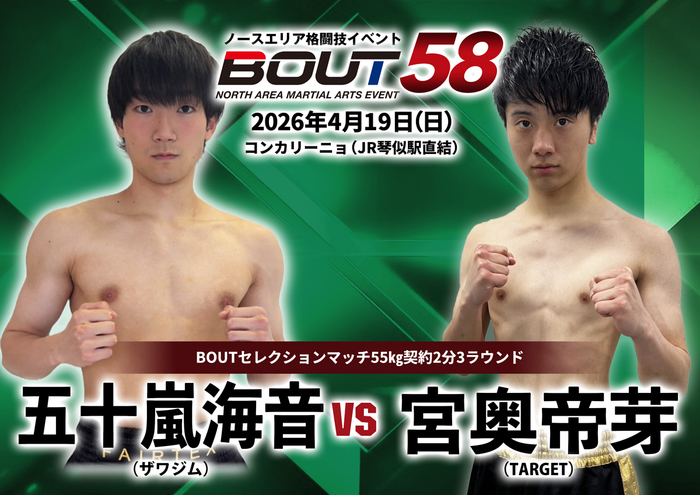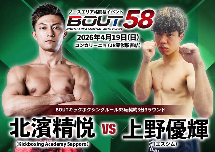 2026年4月19日(日)北海道・札幌市のコンカリーニョにて『ノースエリア格闘技イベントBOUT 58』が開催される。