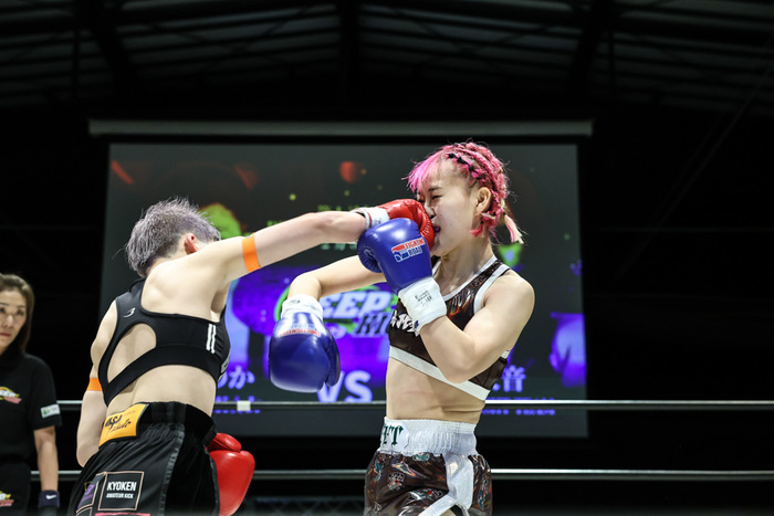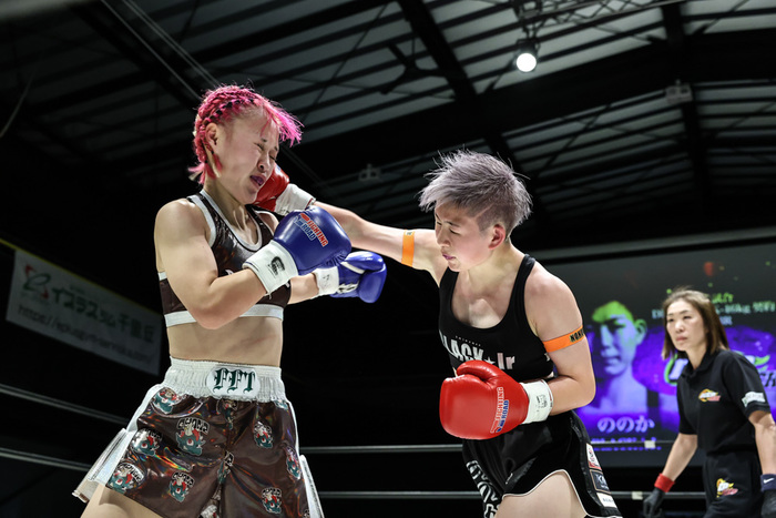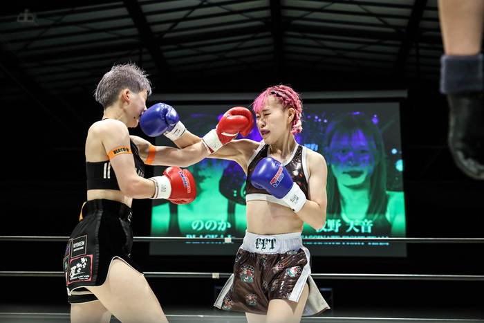 2R、体力に余力を残すののかはえげつない顔面蹴りで天音のアゴを思い切り上げる。続く3Rもワンツー、バックハンド、右のミドルとフックの連打などで追い込み、文句なしのプロデビュー戦を飾った。