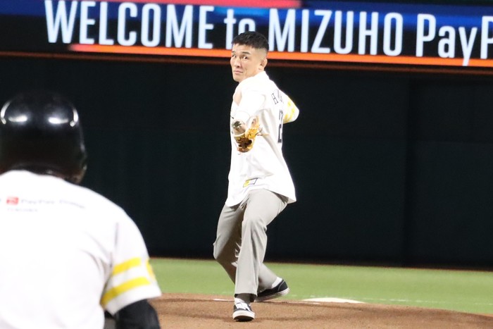 自身のラッキーナンバー「2」を並べた背番号「22」のユニホームでマウンドに上がり、右利きから振りかぶって、武器である右ストレートと同じストレートをノーバウンドで投球し、会場を盛り上げた。