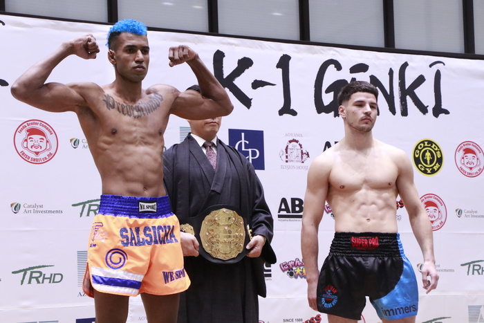 メインイベントの第10試合、第6代K-1 WORLD GPスーパー・ウェルター級王座決定戦3分3R延長1Rで王座を争う、ジョナス・サルシチャ(ブラジル/TF Team/CT Allan Popeye)は69.7kg、ダリル・フェルドンク(オランダ/Fight Team Ringer)は69.7kgでそれぞれ計量パス。