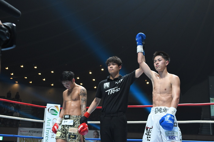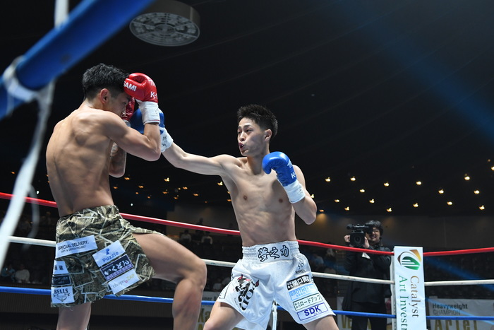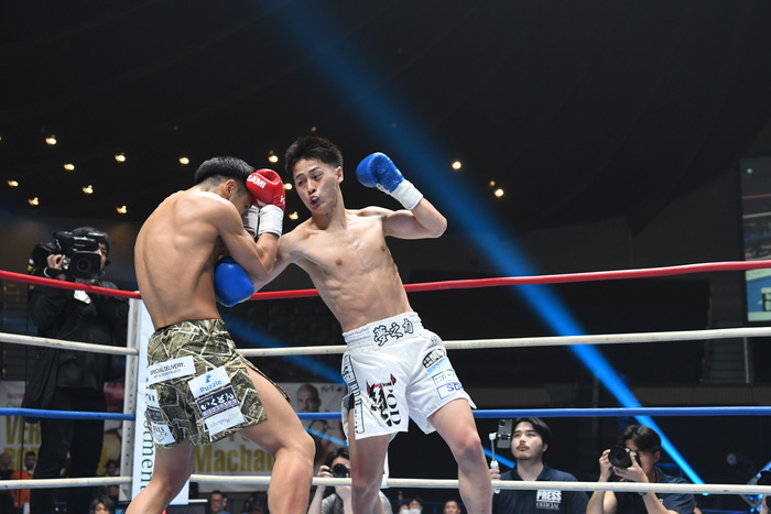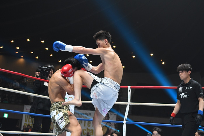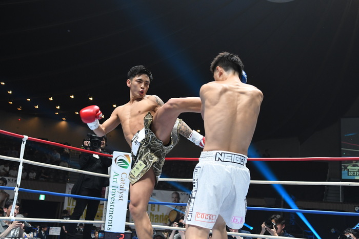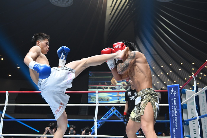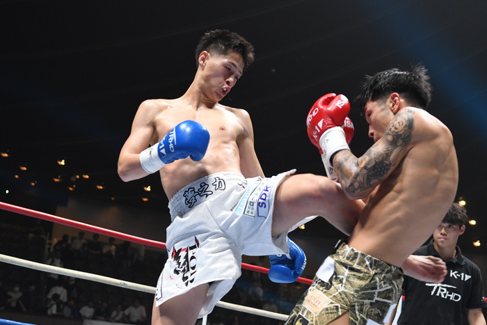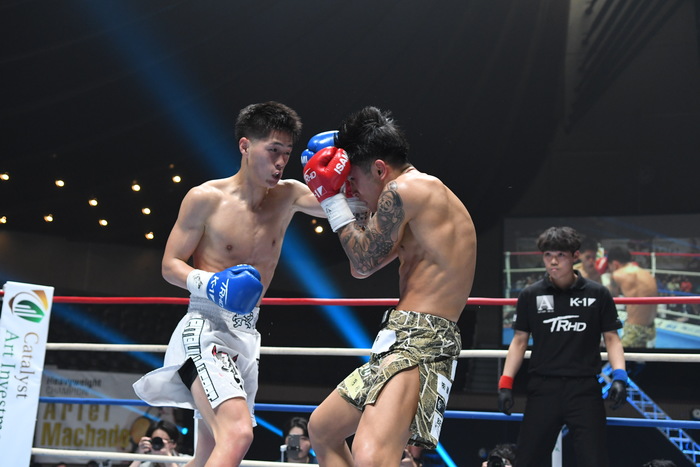 1R、サウスポー同士。白幡はジャブと左ミドル、左カーフ。上遠野は左カーフを蹴り、右ボディから右フック。白幡は前足を上下させ、上遠野を入りにくくさせての左ボディストレート。上遠野はジャブ、右ミドル。上遠野は無理して入らず、両者見合う。