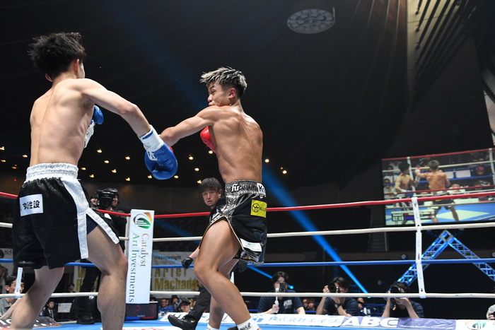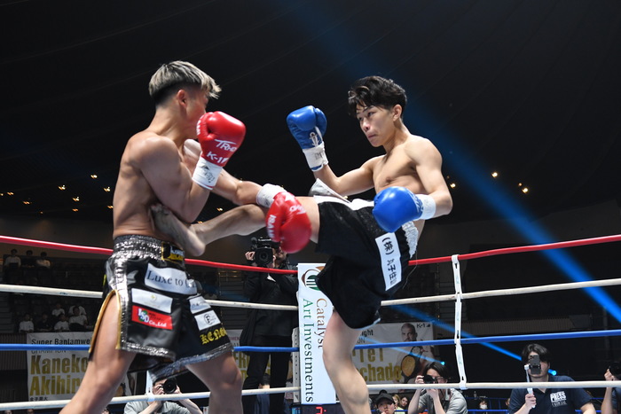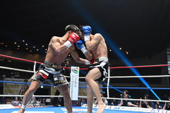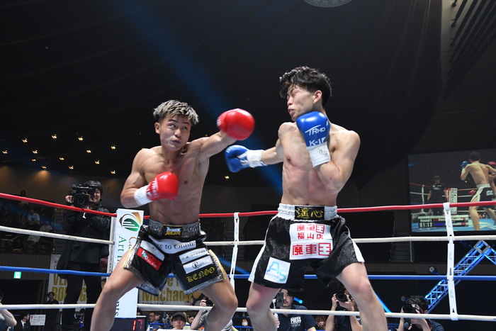 1R、村田は右インロー、サウスポーの遥心は左ミドル。左ストレートを叩き込んで左ローを蹴る遥心に、村田は右インローからヒザ。村田が右のオーバーハンドを大振りしたが、遥心はかわして右フック。互いにジャブを突き合い、村田は左右ボディへ前へ出ていく。