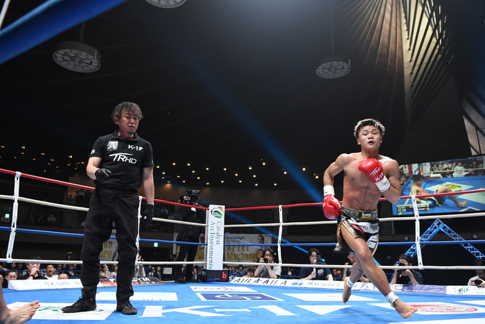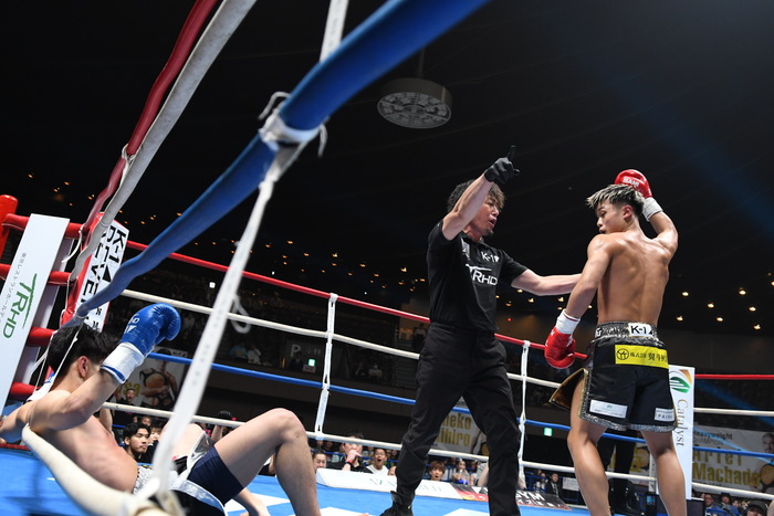 2R、遥心が左ミドルを蹴った直後、村田が左ボディフェイントからの左フックをクリーンヒット。バッタリと後ろに倒れる遥心。村田の鮮やかなKO勝ちとなった。