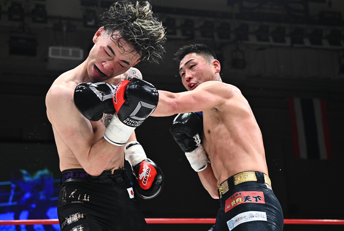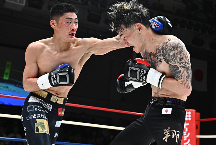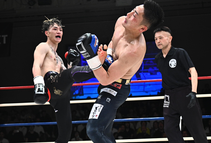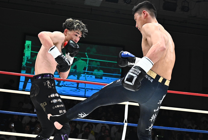 さらに左インローで手塚の左足を何度も蹴り上げる基山。すると手塚が打ち合いに行き、左右のフルスイング。左インローを蹴られながらも右ストレート、右フックを強打し、ダウンを奪い返した。再開直後、手塚が顔面前蹴りでダウンを追加。もう一度、顔面前蹴りで吹っ飛ばした手塚だが、これはスリップ判定。