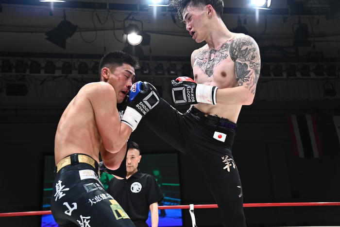 3R、手塚は両手を下げて身体を揺らして挑発。手塚は左ボディを叩き込むと首投げも狙う。ワンツーをヒットさせ、左フックからの右ボディと手塚の攻勢が目立つ。右の三日月も突き刺す。基山は左インローを蹴るが、手数はかなり減っている。それでも左ストレートを連続でヒットさせ、手塚は右ミドルを蹴る。基山の左ストレートに手塚は左ボディ、右アッパーを合わせに行く。OPスコアは10-9×3で手塚がリード。