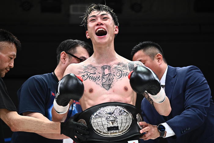 ダウン応酬の激闘を制し、悲願のベルトを巻いた手塚は涙ぐみ「すかしてやろうと思っていたんですけど、嬉しすぎますよ。最高です、マジで。基山くん、俺の病気で2月流しちゃって。今回再起戦になって。俺、2回タイトルマッチやって獲れなくて、もう獲れないのかなと思っていたんですけれど、とりあえず最高っす。俺が1回辞めちゃって、見捨てずにまた受け入れてくれたシーザー会長、ありがとうございます。今日埼玉から170~180人くらい応援に来てくれてて、温かいなと思います。いつもありがとうございます。でもここから王者として自覚を持っていかないといけないから、こんな試合じゃダメだと思うのでもっと強くなって他団体でも他のところでも挑戦させてください」と、もっと強い王者になると誓った。