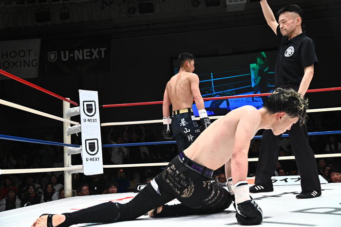 5R開始直後、基山の左ストレート強打がいきなりヒット、アゴが大きく上がった手塚に基山がラッシュをかける。フラつく手塚はロープを背にして右ストレートを打ち返す。そこで基山は左インローも蹴る。サウスポーになる手塚だが、基山は左インローを蹴っていき、ついにダウンを奪った。