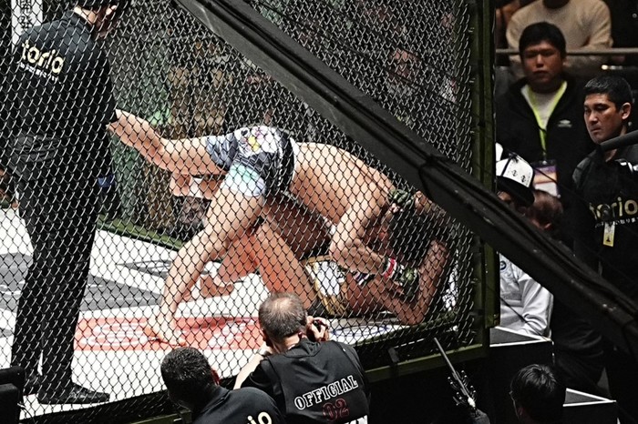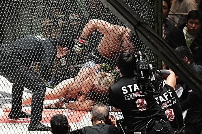 久保は座って手首を解くと、シェイドゥラエフはケージに押し込み、強いグラウンド右ヒザ! 久保に右足をかけて奥の手首もつかんだシェイドゥラエフは、ケージに詰まる久保に両足をかけて右のパウンド連打! 動けない久保を見てレフェリーが間に入った。