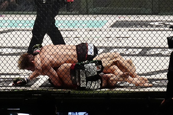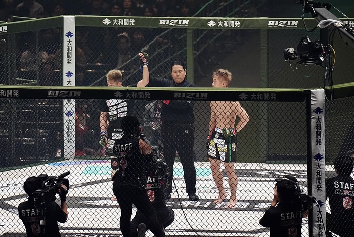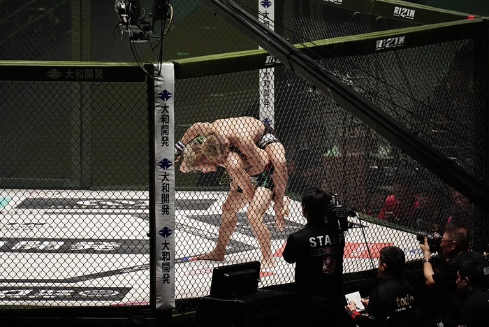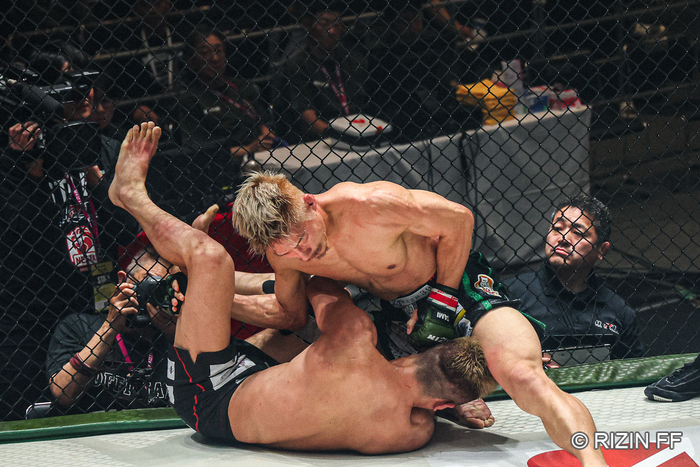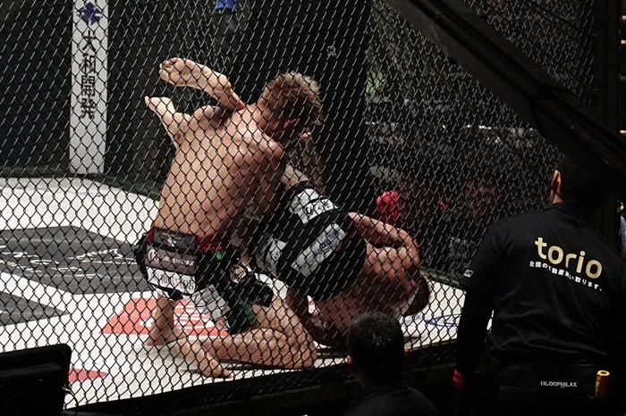 八尋は半回転で正対し、パウンドを打とうとしたが岡本が下から横三角の体勢に。解除した岡本が八尋の両足を抱え、再び上に。岡本が右で細かい連打。八尋は右腕で岡本を抱え、両足を岡本の左足に絡めて防御する。そのまま試合終了。