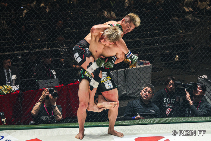 2Rも前に出る岡本が、ボディへの連打からダブルレッグでテイクダウン。サイドをとると八尋がブリッジ、すぐに岡本がバックを奪う。岡本を背負ったまま立ち上がる八尋。岡本は右腕で殴り、その右腕を首に巻いて後ろに倒れる。