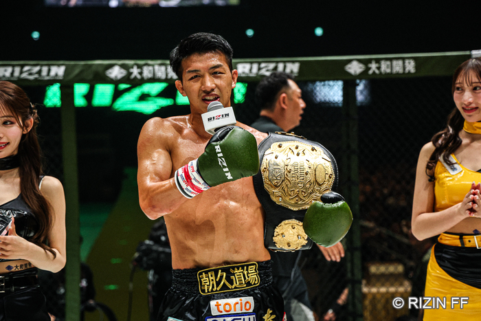 マイクを持った朝久は「K-1から来ました。現役王者の朝久泰央です。ごめんなさい、本当は蹴りでもうちょっとスパッとカッコよくやりたかったけれど、シンパヤックも強かったのでパンチになってしまいました。こうしてK-1から来るってことでみんなからいろいろな意見があると思うけれど、現役チャンピオンである俺をこうやって出してくれたK-1、そしてキックボクシングで正直言ってよくいらないって言われるけれど、こうして7試合目といういいポジションで組んでくださったRIZIN関係者の皆さん、ありがとうございます。僕はまたK-1の現役王者としてK-1に戻ることになるけど、またRIZINで見たいなって思った時は呼んでくれたら嬉しいです」とお礼。