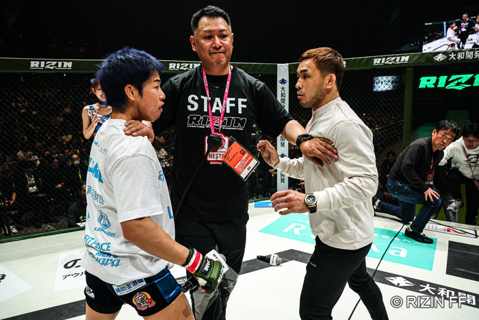 扇久保が「6月、ボコボコにしてやるから」と言えば、神龍は「最高じゃねえか。やってみろよ」。ここで扇久保が神龍を突き飛ばし、両者は乱闘寸前に。レフェリーや関係者が両者を止めに入った。