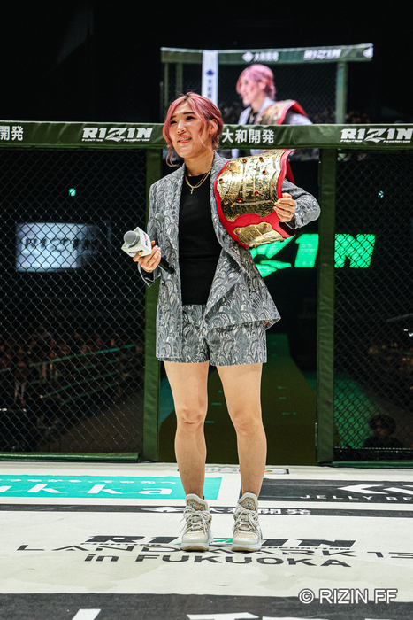 王座を返上することになった経緯については「もちろんRIZINさんと2~3回話させてもらって、ベルトをどうするかって話も何回かさせてもらいました。持っていてもいいよって話にもなったりしたんですけれど、ここで1回返上して。逆に返上することで女子格闘技がもっと盛り上がるなって自分でも思ったので。SNSを見てても次は誰がチャンピオンになるんだって話になってくるので、自分がチャンピオンでいてその相手を待つよりも、1回返上して誰がチャンピオンになるかってところで盛り上げた方が女子格闘技全体が盛り上がると思いました。本当は持っていたかったんですけれど。だから凄い悔しいんですけれど、女子格闘技を盛り上げたいっていうのが自分の中の一番強い気持ちなので。悔しいけれど今は我慢。ただ、戻ってきたら即行取り返そうと思っています」とした。