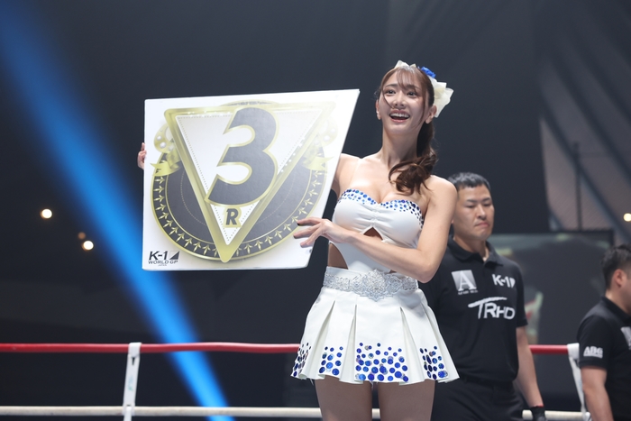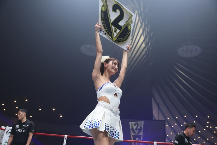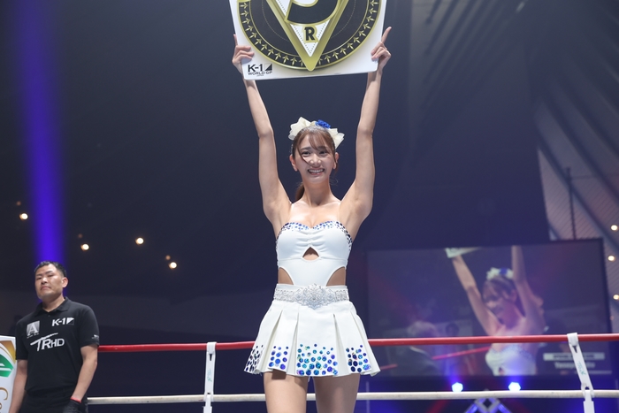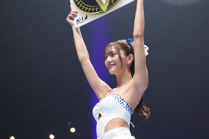 今回は白地にK-1ブルーをあしらい、華やかさを演出したミニ丈の衣装で登場。これは2025年11月15日の『K-1 WORLD MAX 2025~-70kg世界最強決定トーナメント・決勝ラウンド~』で、初めてスペシャルラウンドガールとして登場した時の衣装で、「身体のスタイルがどこから見ても綺麗なように工夫して作っていただいた」というもの。