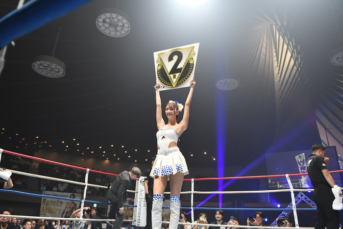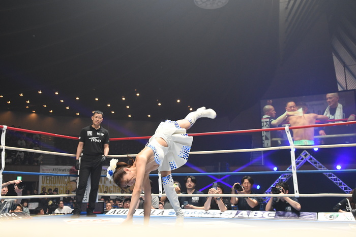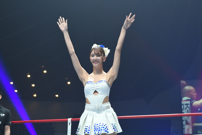 リング上では、173cmの長身、長い脚がリング上でしなやかに1回転する美しい側転を披露してから、ラウンドボードを持ってリングを1周。日本一歩き方が美しい人を決めるコンテスト『THE WALK JAPAN 2026 日本大会』にて「2026 BEST WALKNIST AWARD」を受賞しているだけに、リングウォークでも魅せた。側転に関しては「もともと器械体操を中学一年生からやっていまして、高校も体操の特待生として入ってキャプテンをやってたりとか、結構真剣に取り組んでいたので」と、簡単にこなせる理由を話している。