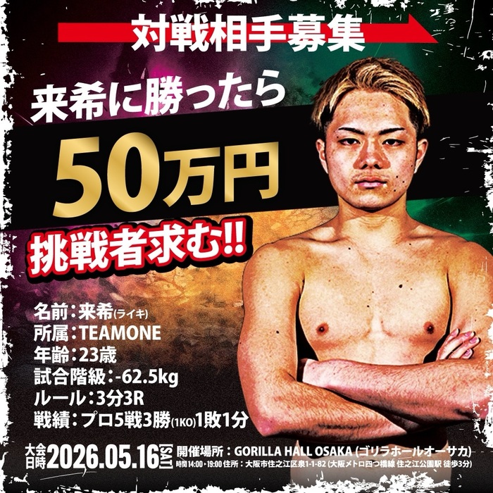 vol.1から連続出場しているNARIAGARIファイターの来希(TEAM ONE)への挑戦試合も決定。この試合は特別ルールとして、来希に勝利した場合は賞金50万円が贈られるという高額インセンティブ付きの一戦となる。対戦相手については現在募集中で、後日発表予定。