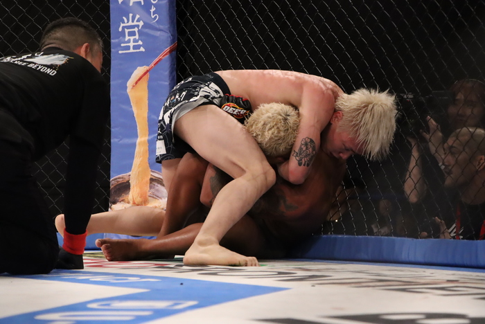 1R、詰めて組んでボディロックテイクダウンのレオン。立つ石原を再び崩してバックからボディトライアングル。ずらして立つ石原にボディ打ち、ヒザ。左で差し返して体を入れ替える石原をすぐに回してヒザ突くレオン。石原はバックブロー。かわしたレオンが詰める。
