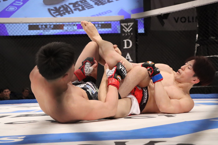 2R、ダブルレッグテイクダウンの高橋。サドルロックから内ヒール狙い。足を組んで防ぐ安永。足を外してバックに移行の高橋はボディトライアングルでバックからパウンド。マウントから腰を押して足を戻して脇差した安永がトップになってゴング。