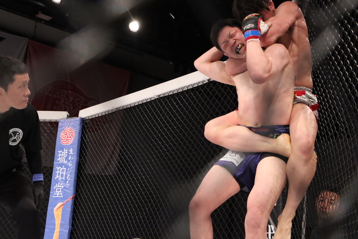 1R、左右で詰めたトミーがシングルレッグから村上を崩してバックに乗ると、背中に乗せた村上にトミーは背後からリアネイキドチョーク。最後はグラウンドに引き込んで極めた。