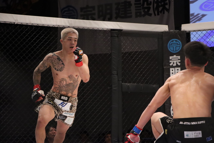 2R、右カーフ、左ミドルボディ打ちの寉岡に、川口は左ジャブを刺してボディロックテイクダウン。立つ寉岡にジャブロー。左をかわして脇潜りバックへ。スクランブル狙う寉岡をかつぎパス。立つ寉岡と左右を打ち合い、ゴング。