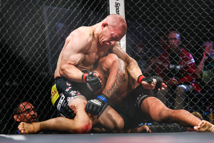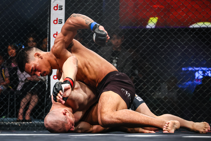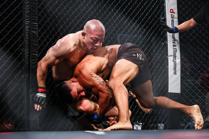 サイドバックで腰を抱くクーパーは左のパウンド、西條をめくって仰向けにさせると西條はハーフに。左で差す西條に、頭をアゴ下につけて寝かせるクーパーだが右目周辺から出血も。右で腰を抱いてケージに押し込み、左の細かいパウンド。さらに左ヒジを押し付けて滑らすクーパーに、西條は右ヒジを着いて上体をケージに立てて座ると、両足を引き付けるクーパー。