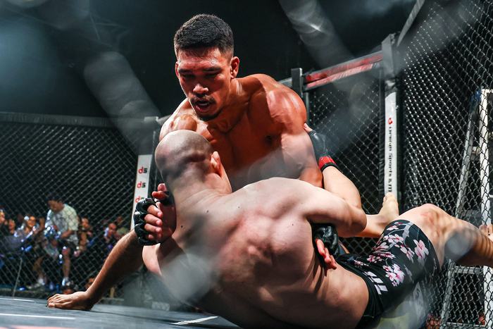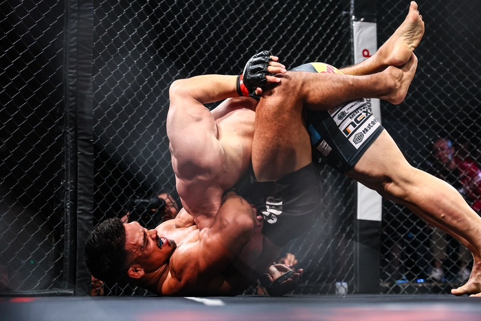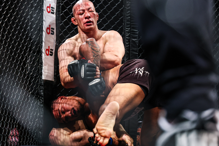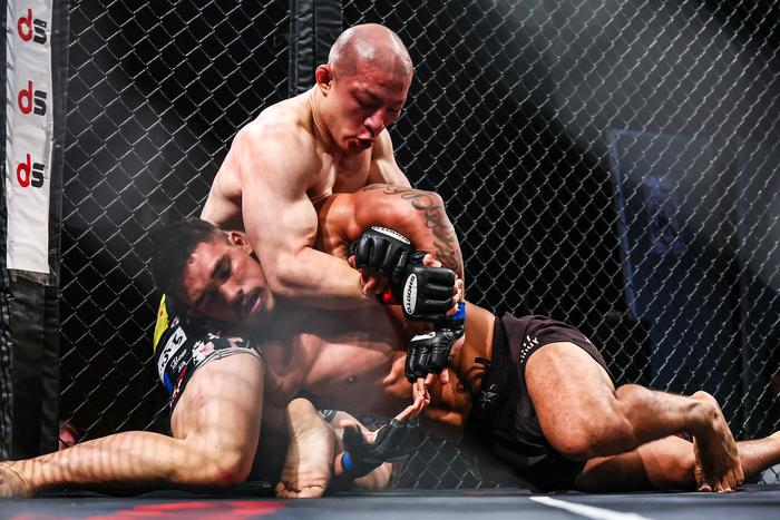 しかしすぐにうつ伏せからシングルレッグで立とうする西條。そこにアームインギロチンを合わせるクーパーはクローズドに西條を入れる。絞るクーパーに、右ヒザを押して頭を抜いた西條が上に。