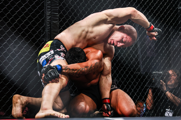 詰めて左から右フックを当てたクーパー。右前蹴りを突き、左前蹴りのフェイントで前に着地して右ストレート。そこに左を狙う西條は、右ストレートも。かわしたクーパーに遠間からダブルレッグに入る西條。切ったクーパーに下になった西條。