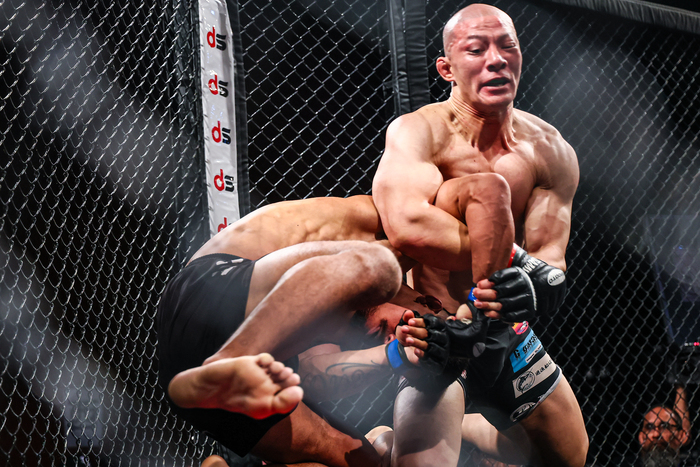 左手首を取りに来たクーパーから手を抜き左手をマットに着くと、右小手で回して立ち上がり。さらに小手投げで腰に乗せるが、クーパーは残して正対。右で差して体を入れ替えた西條が押し込み、右をかちあげて脇を開けさせて右ヒザ! もう1発ヒザ。続けて抜群のタイミングでダブルレッグに入るが、左で差し上げてめくって上になるクーパー!