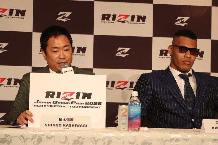 会見には、柏木信吾タレントリレーションズが参加。出場選手として上田幹雄(BRAVE)、スダリオ剛(HI ROLLERS ENTERTAINMENT/PUREBRED)、エドポロキング(ROOTS GYM)の3選手が登壇した。柏木氏は「優勝者はアレキサンダー・ソルダトキンと大晦日で対戦して、RIZINの初代ヘビー級ベルトを懸けた戦いを行ってもらいたい」との希望を提案。