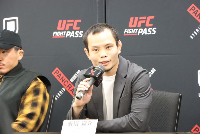「今日、午前中に、試合の研究のために『危険生物展』を見に行ったんですけど、そこではマムシやらコブラやら危険生物がいっぱいいたんですけど、その中で一番危険なのは僕なんで、そこを証明していける試合にできたらと思います。野田選手ももちろん危険な選手、オールラウンダーで危険な選手ですけど、僕も危険な選手なので、デンジャラスなPANCRASEをお届けしたいと思います。よろしくお願いします」