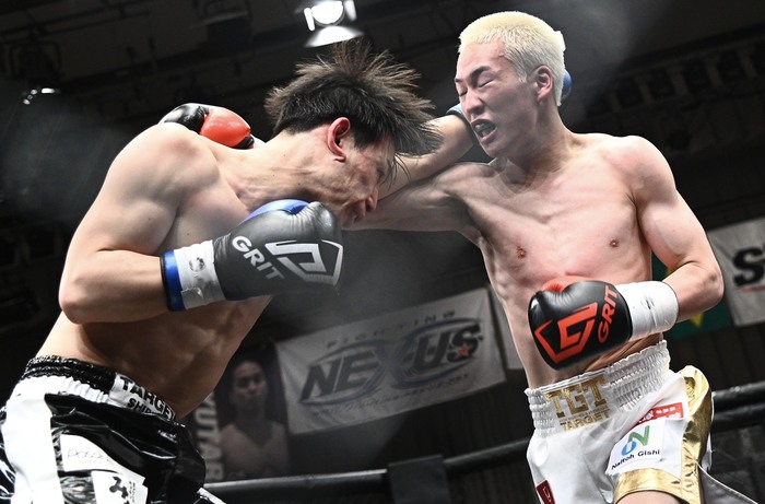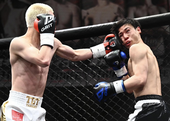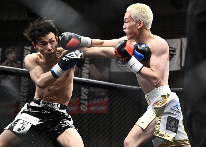 ジャブ、ストレート、右ローで詰める相沢に小野は左ジャブも、追う相沢は左ボディ、右アッパー。小野は右カーフ、右ミドルも単発。