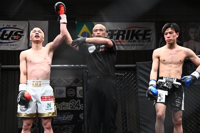 判定3-0(30-27×2, 30-28)で相沢がSTRIKE NEXUS初代バンタム級(53.0kg)王者となった。ベルトを巻いて涙の相沢は「アマチュアとか含め初めてベルトを巻けて嬉しいです。水抜き諦めかけたんですけど、頑張ってよかったです。TARGETのプロ練メンバーのおかげで、菅原さんのミットが毎日キツくても耐えて良かったです。エリカ先生にみてもらって、昨日もメッセージをくれてありがとうございます。父ちゃんと母ちゃん、応援ありがとう。まだ自立してないですけど、頑張ります。来場してくれた方々、ありがとうございました」と感謝の言葉で締めた。