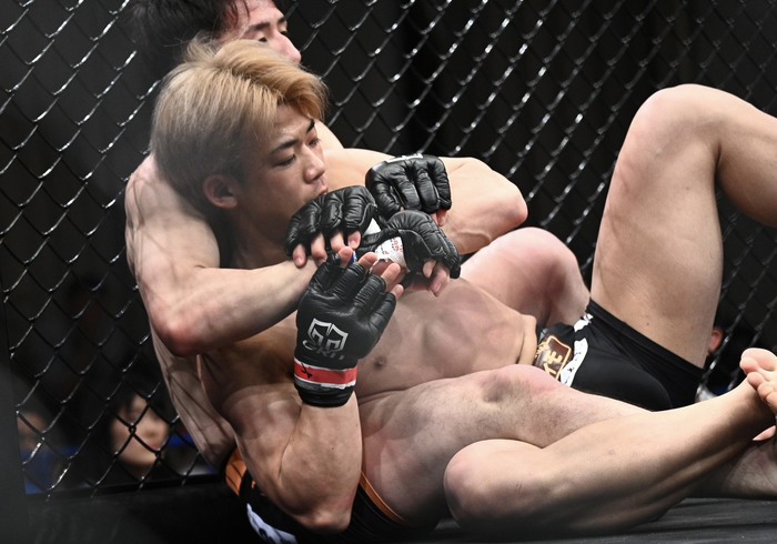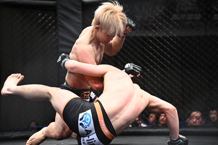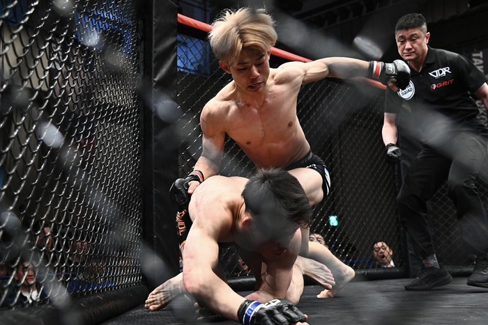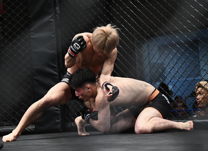 戻す奥村のボディロックテイクダウンから立つ塩谷に右足をかけてバックバックに引き込む奥村。向き合った塩谷は右でダウンを奪うと、立ってきた奥村にさらに左右でダウンを奪いパウンドに、奥村陣営からタオルが投入された。
