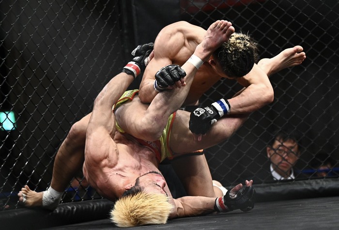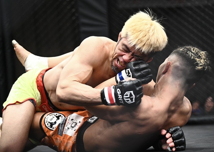 2R、右で差して組む村田を突き放す島袋。村田の入りに右を合わせて崩して上に。フルガードの村田の腰を抱くが、金網使い立つ村田は首投げテイクダウン。下から左でオーバーフックする島袋もヒジ。残り30秒でパウンド連打の村田に足を効かせてから潜りレッスルアップの島袋。