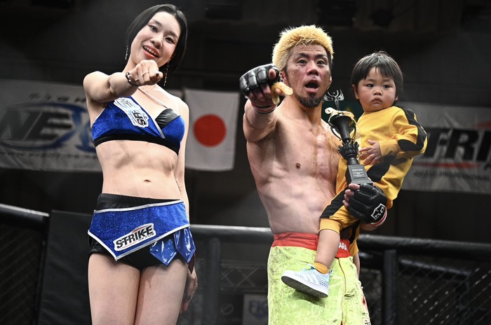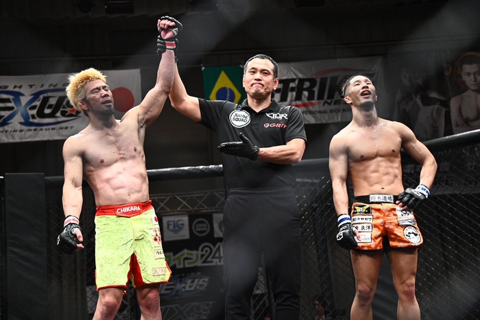 19-19, 島袋20-18×2の2-0で島袋が勝利。「デビューして16年経ちますが、マイク持つのは実は初めてです。22歳でプロデビューして45歳、44戦で負け越してますけど、やっぱりMMA楽しいし好きです。格闘技は一人じゃできないんで、村田さん、練習仲間、ありがとうございます。そして好きなことをやっていいと背中押してくれる妻と子供に感謝します。また上を目指して頑張っていきます」と語った。