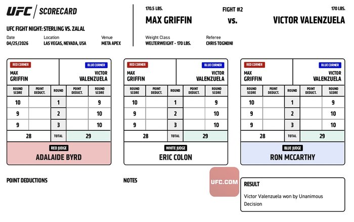 DWCSを経て、Lemino修斗で木下憂朔を2R KOに下したヴィクトル・ヴァレンズエラが緊急参戦でUFCデビュー。グリフィンはオクタゴンで11年の40歳。