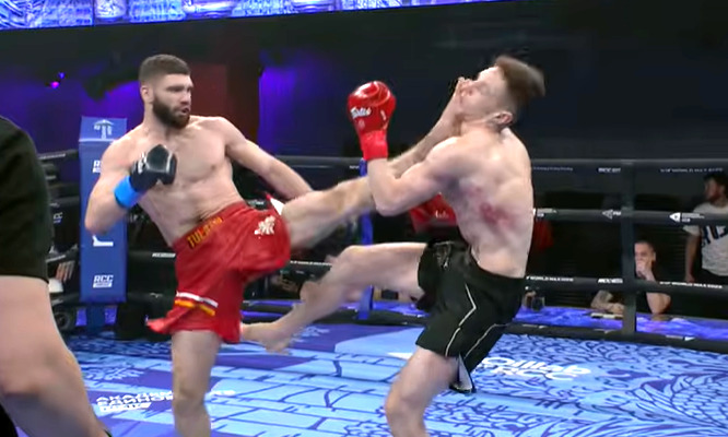 1R、ファティコフは左右フックで先制攻撃。トゥラエフはローキックにフックを合わせる。そして前蹴りを顔面へ。ファティコフは攻め込むも、カウンターを食らうことに。手数が減るとトゥラエフは、左の蹴りからパンチへつなげる。ファティコフはスーパーマンパンチで飛び込むも不発。パンチを合わせるのがうまいトゥラエフが、やや優勢か。