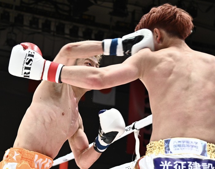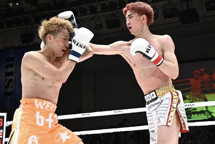 1R、序盤はジャブを突き、左ミドルを蹴る各務のペース。中盤からはどんどん距離を詰める西方が左右フック、ボディで攻める。左右にスイッチする西方は前へ出て打ち合いに行く。