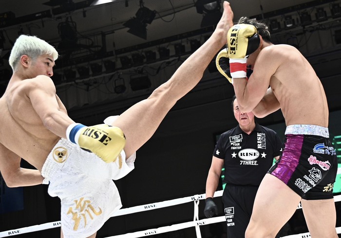 2R、塩川の前蹴りにも距離を詰める奥山が右ストレート。奥山の前蹴りはローブローとなって試合は中断。塩川は左ハイをブロックさせておいての左三日月、奥山は左右フックで入っていくがそこに塩川が顔面前蹴り。それでも左右フックを打ちに行く奥山に塩川が左フックからの右フックを打ったところで奥山が後ろによろめき、これがダウンとなる。