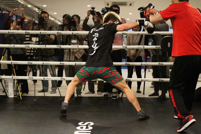 12月2日から16日(日本時間)まで約2週間、米国のホルヘ・リナレス(元プロボクシング3階級王者)のプライベートジムで合宿を積んできた那須川は、公開練習ではリナレスから勧められたレスリングシューズを着用して、シャドーとミット打ちを各1Rずつ披露。シャドーではスーパーマンパンチ、葛西裕一氏が持つミット打ちでは裏拳の軌道のジャブなどを見せた。