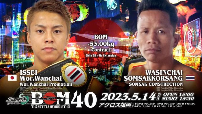 - ニュースムエタイ2023.05.05【BOM】石井一成の対戦相手がMAX MUAYTHAI2階級制覇に変更、同日東京で行われる吉成名高の試合を会場で生中継2023年5月14日(日)福岡アクロス『BOM 40』に出場するWBCムエタイ世界スーパーフライ級王者イッセイ・ウォーワンチャイ(=石井一成/ウォー・ワンチャイプロモーション)の対戦相手の変更が発表された。 イッセイは当初、ブーン・サックヨーティン(タイ)と対戦予定だったが、日本に入国するためのビザの不備により欠場。代替選手としてワシンチャイ・ソムサックコーサン(タイ)が出場する。ワシンチャイ