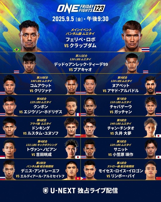 2025年9月5日(金)タイ・ルンピニースタジアム『ONE Friday Fights 123』(U-NEXT配信)に、日本人選手3名の出場が発表された。