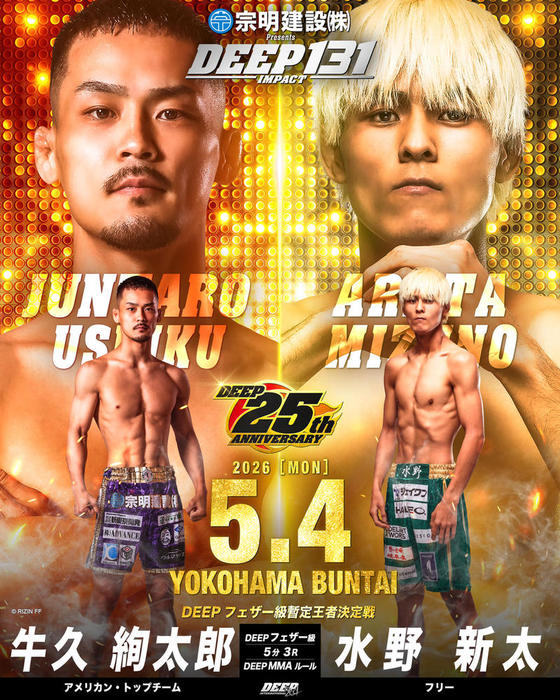 DEEPフェザー級正規王者の青井人が防衛戦のスケジュールが合わないため、元RIZIN&DEEPフェザー級王者の牛久絢太郎と(ATT)、25年のDEEPフェザー級GPで優勝した水野新太(フリー)が「暫定王者戦」で対戦が決定した。