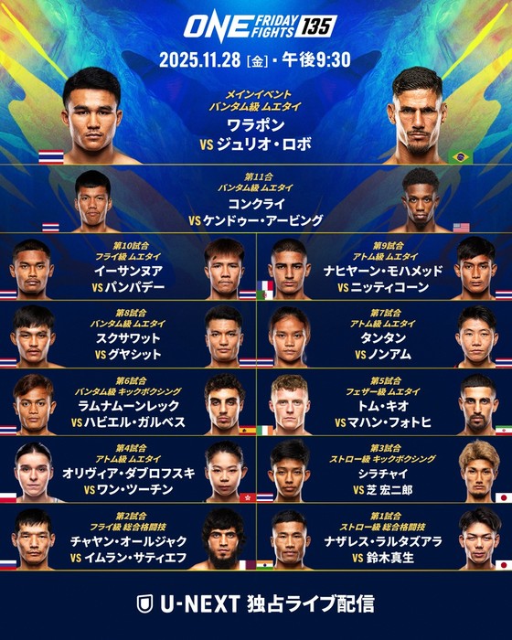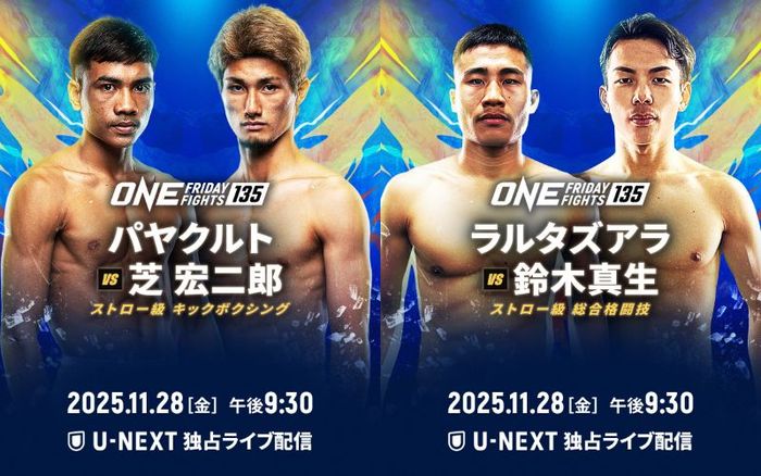 2025年11月28日(金)タイ・ルンピニースタジアム『ONE Friday Fights 135』(U-NEXT配信)に、今週も日本人選手2名が出場する。  第1試合のONEストロー級(-56.7kg)MMAでは、鈴木真生(MMA RANGERS GYM)がナザレス・ラルサズアラ(インド)と対戦。  鈴木は空手ベースで2024年1月、プロ修斗のトライアウトで堀澤義紀に三角絞めで勝利。優希から右
