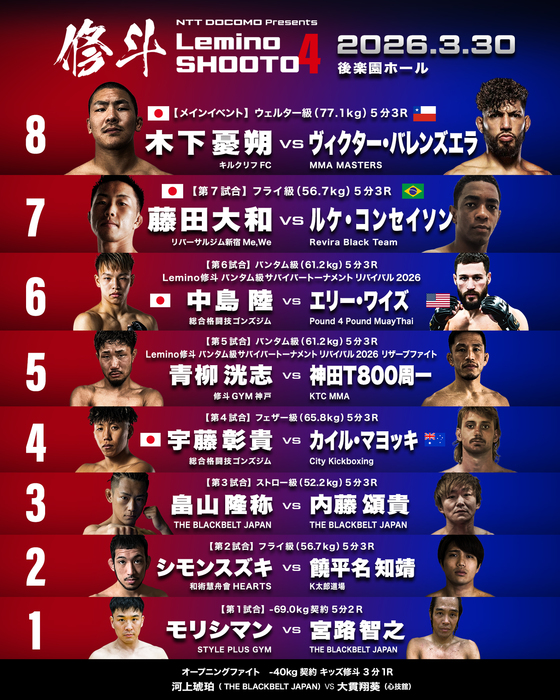 米国フロリダのキルクリフFCを拠点に活動している木下は、2年半ぶりの試合に向け、 2月18日の『Lemino修斗.3』内でのビデオメッセージで「UFCをリリースされて“何しとったんや”と思う方がほとんどやと思うんですけど、練習だけはしていたんで、しっかりとお見せします。楽しみにしていてください」と意気込みを示している。
