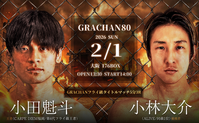 80回記念大会となる同大会のメインは、第4代GRACHANフライ級王者・小田魁斗(CARPE DIEM福岡)の初防衛戦。同級1位の小林大介(ALIVE)が挑戦する。