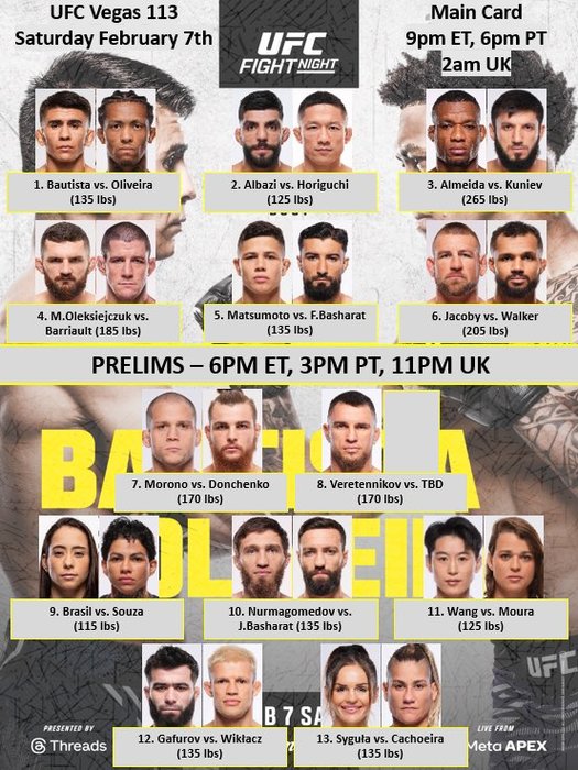 - MMAUFC Fight Night: Bautista vs. Oliveira 堀口恭司vs.アルバジ2026年2月8日(日)Meta APEX