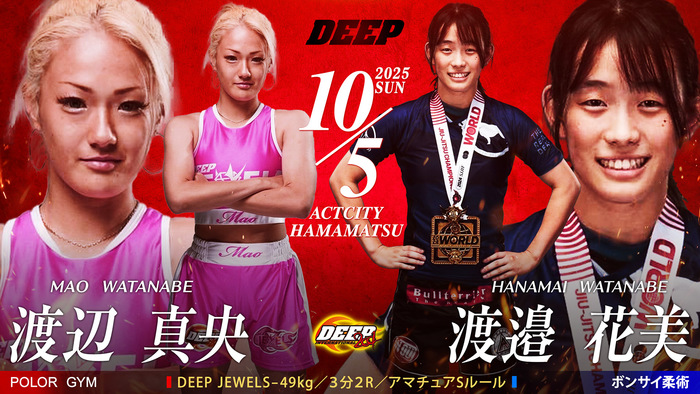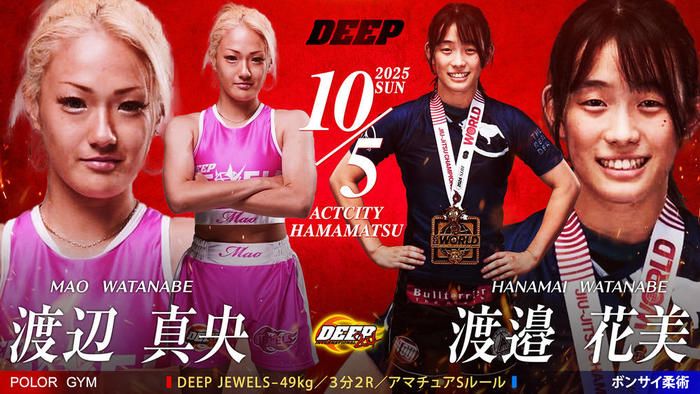 - ニュースMMA2025.08.13【DEEP】ホベルト・サトシ・ソウザの秘蔵っ子・渡邊花美がMMAデビュー、大井すずに一本勝ちした渡辺真央と対戦。ほか16カード発表=10月5日(日)『DEEP HAMAMATSU IMPACT 2025 2nd ROUND』2025年10月5日(日)静岡県浜松市のアクトシティ浜松展示イベントホールにて開催の『DEEP HAMAMATSU IMPACT 2025 2nd ROUND』のカードが発表された。 5月25日の『DEEP JEWELS 49』で大井すずに一本勝ちした渡辺真央(POLOR GYM)が、ボンサイ柔術の“天才女子”渡邊花美と対戦するJKファイター対決など、下記16カードが発表されている。 ▼DEE